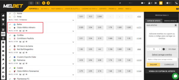 Selecione o evento em que você quer lançar sua bet futebol. No exemplo abaixo, escolhemos o jogo do Campeonato Brasileirão Série A entre o Clube Atlético Mineiro e o Bahia: