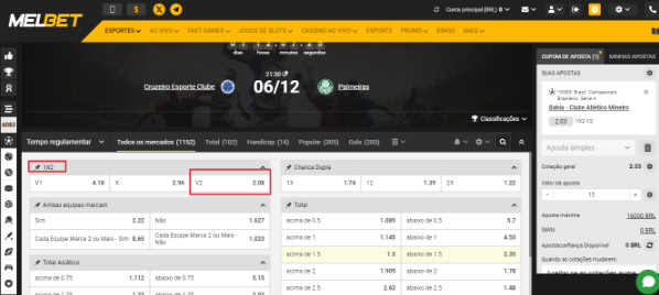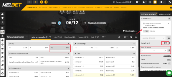 Por fim, basta escolher o mercado e clicar em cima dele para adicioná-lo ao cupom de aposta. No exemplo, selecionamos o mercado 1x2 e colocamos a nossa aposta no Clube Atlético Mineiro como vencedor.