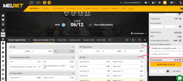 Para isso, basta clicar em cima do evento e a tela com os mercados de apostas aparecerá. Note que a aposta simples feita no jogo entre Atlético MG e Bahia segue incluída em nosso cupom de aposta:
