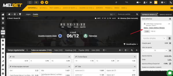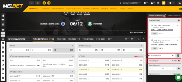 No exemplo abaixo, vamos criar uma acumuladora com base na aposta simples que havíamos feito no jogo do Clube Atlético Mineiro e do Bahia. Neste caso, vamos selecionar também uma aposta de futebol em outra partida do Brasileirão Série A: entre o Cruzeiro e o Palmeiras.