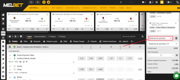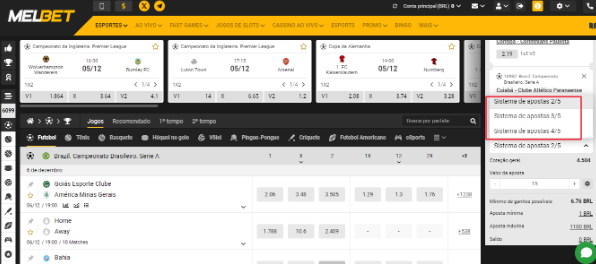 Outra opção disponível para quando você quiser fazer 3 ou mais seleções de apostas online futebol na MelBet é o sistema de apostas. Esse formato é parecido com o acumulador, no entanto, nas apostas de sistema, não é preciso que todas as seleções sejam vencedoras para que a sua bet futebol feita no sistema ganhe. Funciona como um acumulador parcial, ou seja, mesmo que parte das seleções seja vencedora, você ainda consegue obter ganhos parciais.