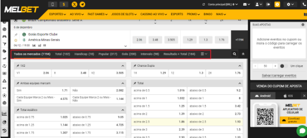 No exemplo acima, são mais de 1000 resultados possíveis dentro dos mais variados mercados que você pode apostar para uma partida entre Goiás e América Mineiro.